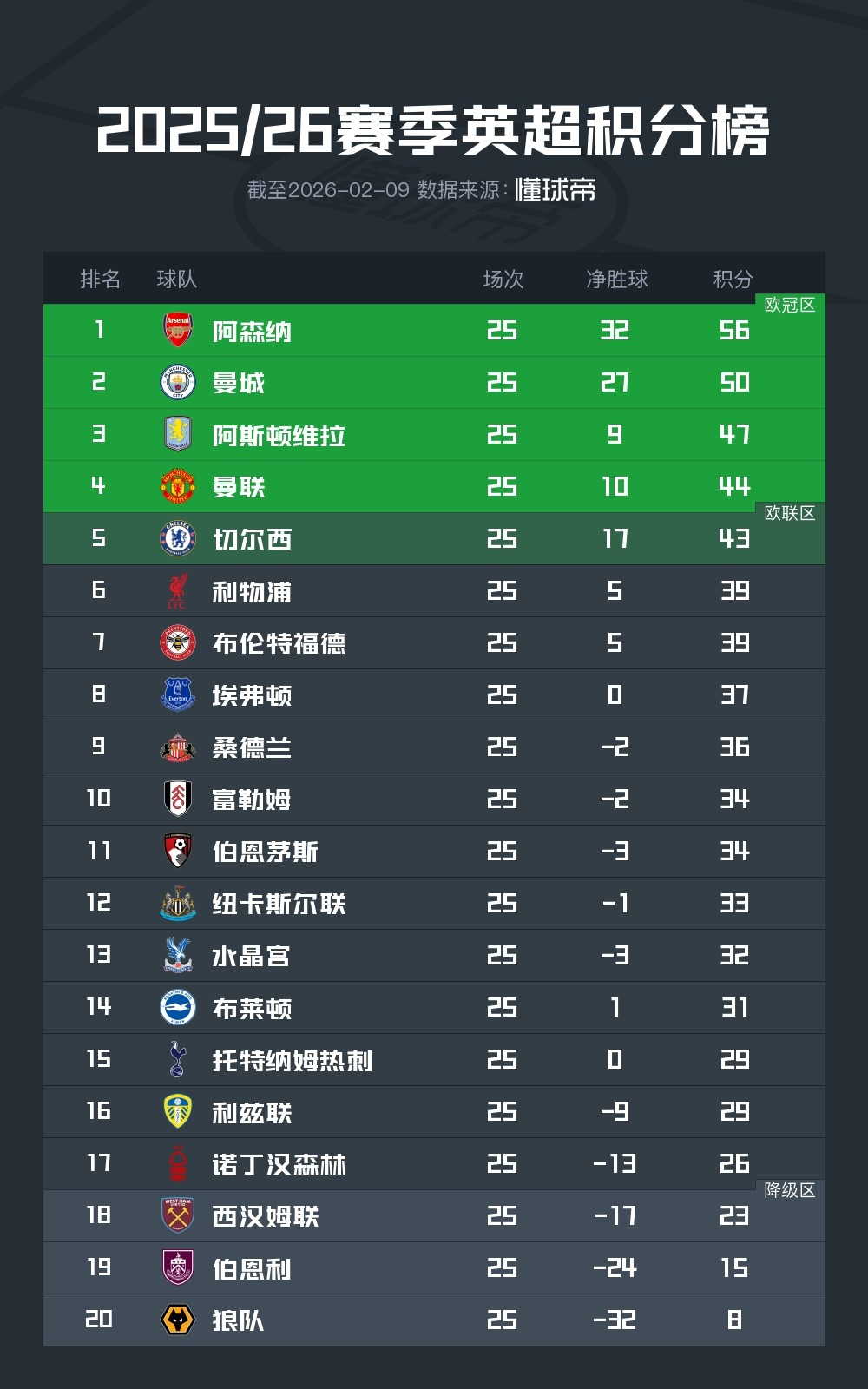 英超积分榜:阿森纳仍6分领跑,利物浦已落后前五4分